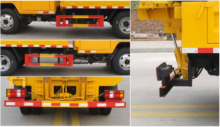 該車專用裝置為:車載式緩撞裝置,主要用于移動施工、臨時性封閉車道或交通事故處理及搶險現場,降低城市道路施工、高速公路養護等作業中的安全問題.ABS系統型號:APG3550500A,ABS系統生產廠家:浙江亞太機電股份有限公司.側/后部防護材料均為:Q235碳鋼,側防護采用螺栓連接,后防護采用焊接連接,后部防護截面尺寸(mm):100×50,后部防護離地高度(mm):420. |